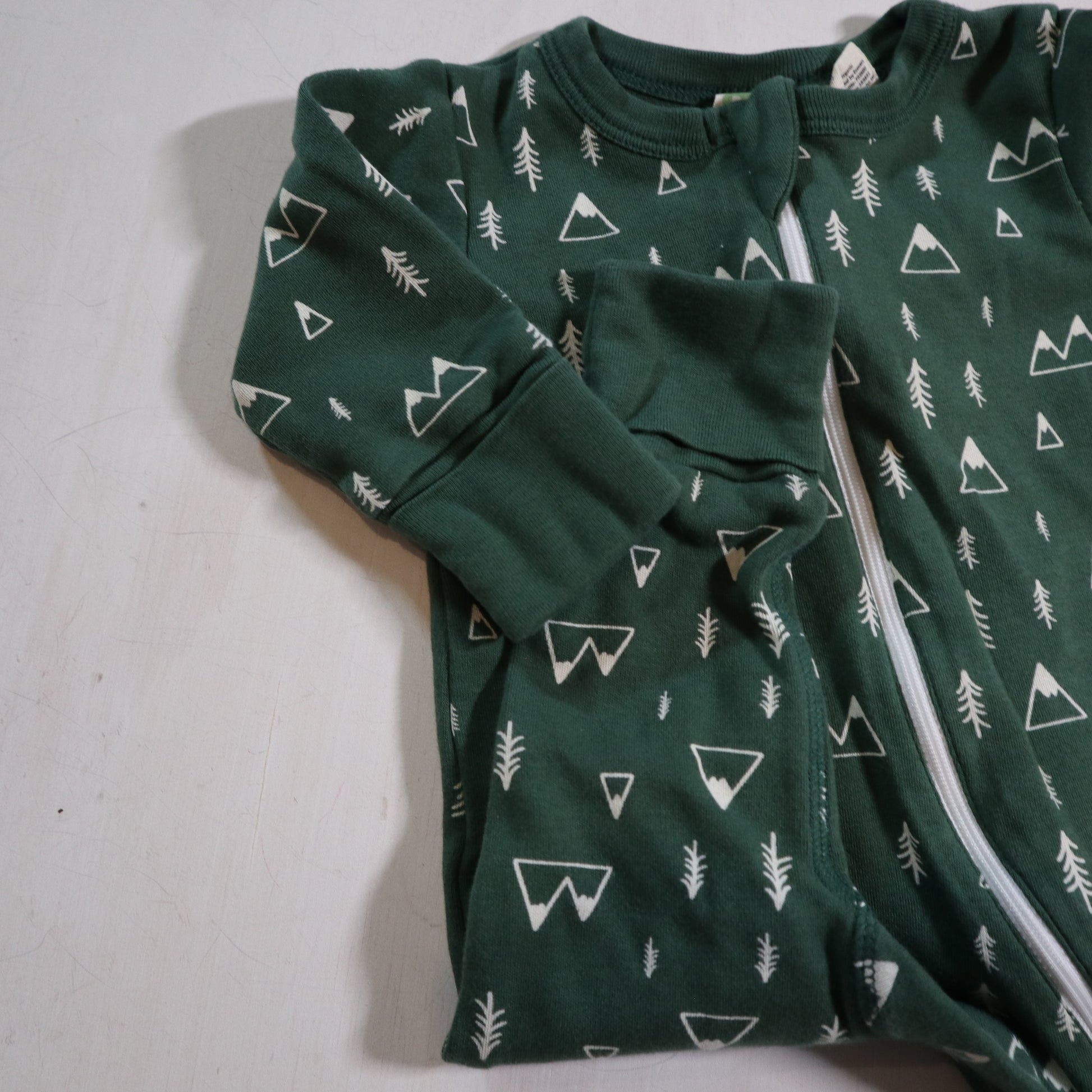 Details - green with trees, fold over hands and feet, organic cotton