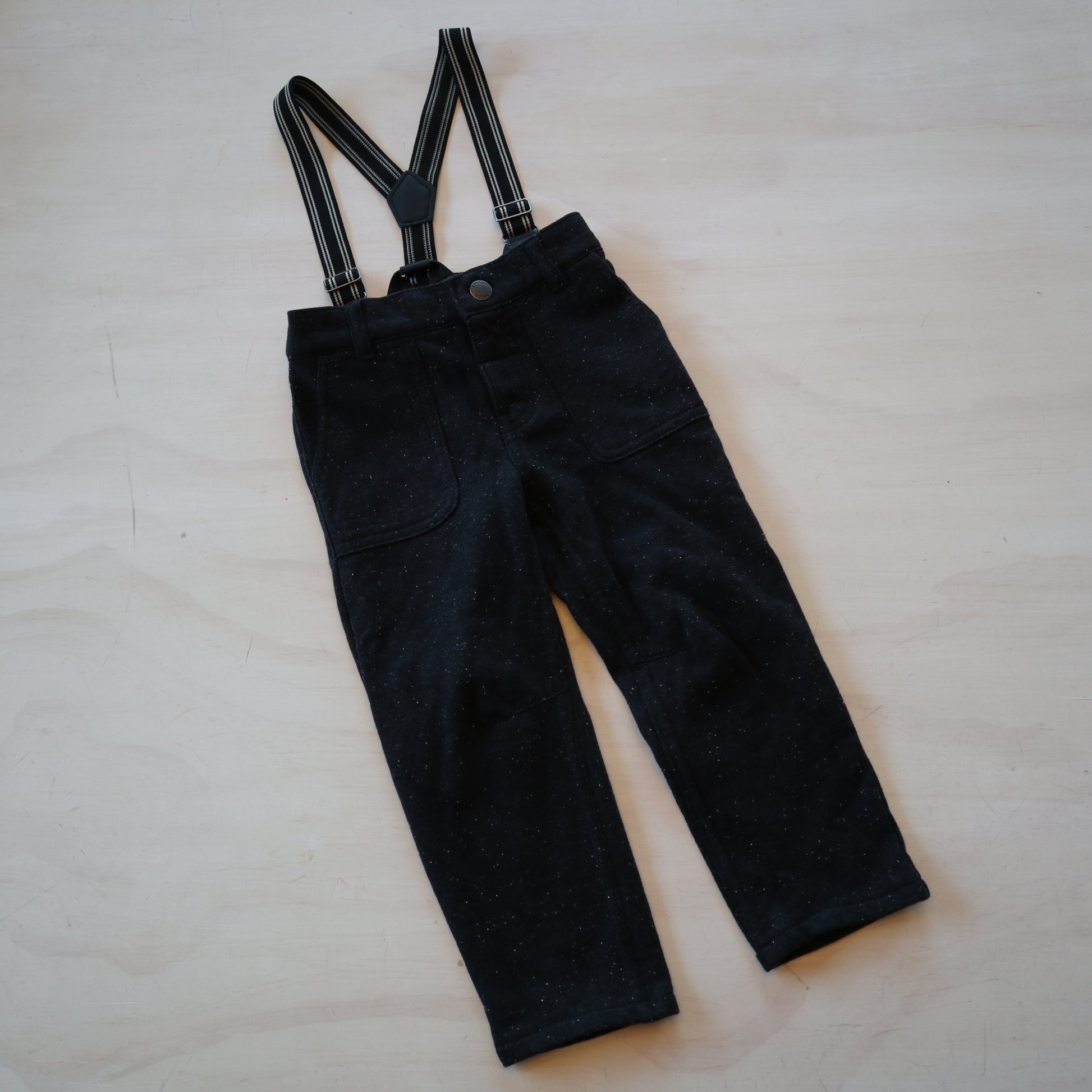Details - Black speckled pants, removable suspenders